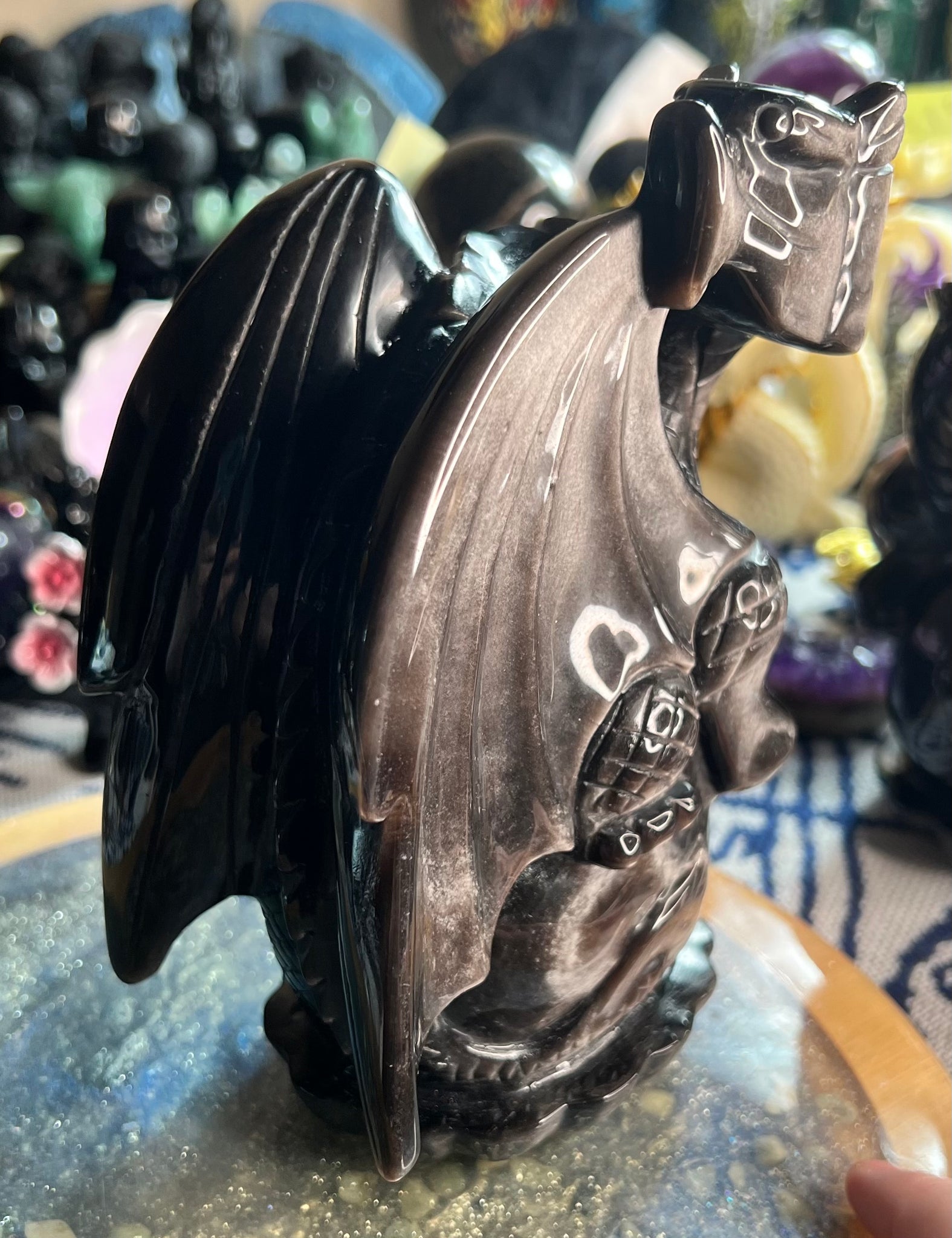 7 inch tall, full body silver sheen obsidian dragon, perched on a sphere. 4.5 inches wide, this master carved, detailed and polished to an impeccable shine is one of two only in stock.